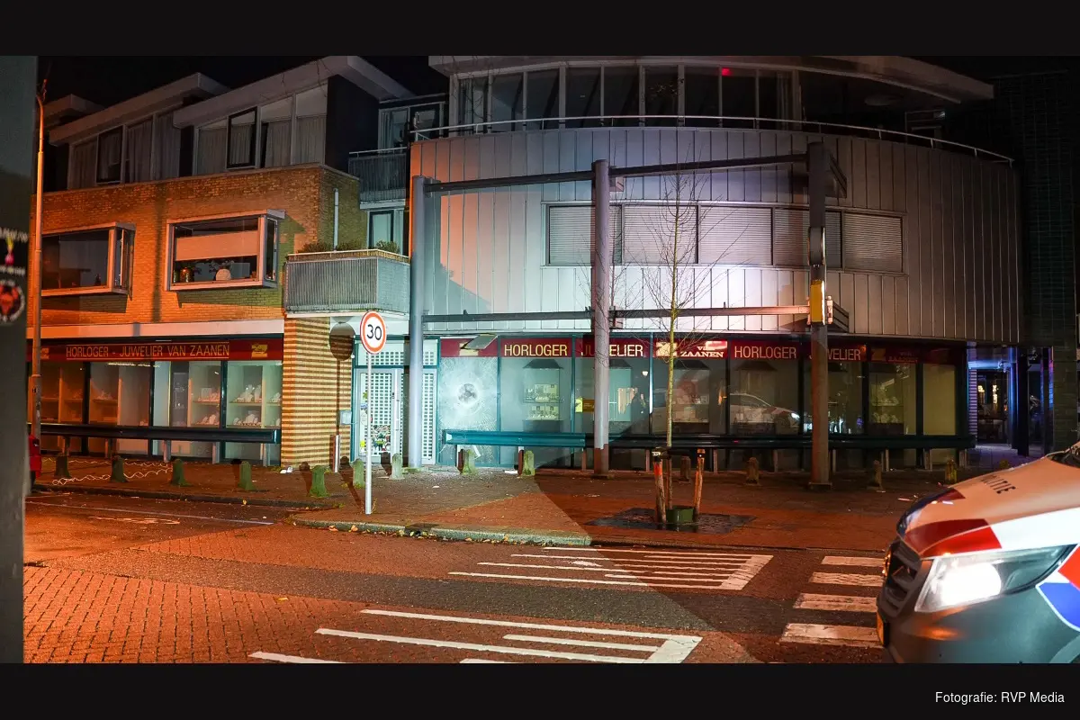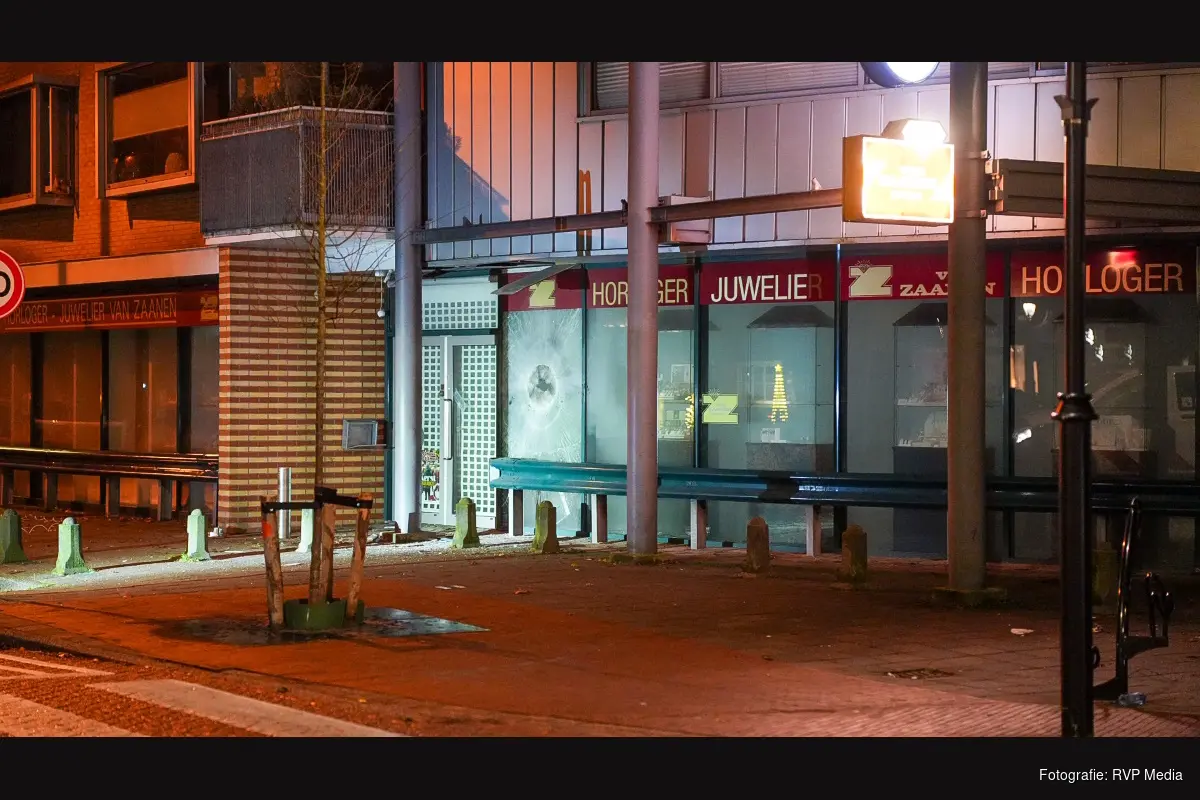 Bij Juwelier van Zaanen is een raam vernield door een explosie. Op de grond ligt een wit draad wat vermoedelijk is gebruikt voor de ontsteking van het explosief.