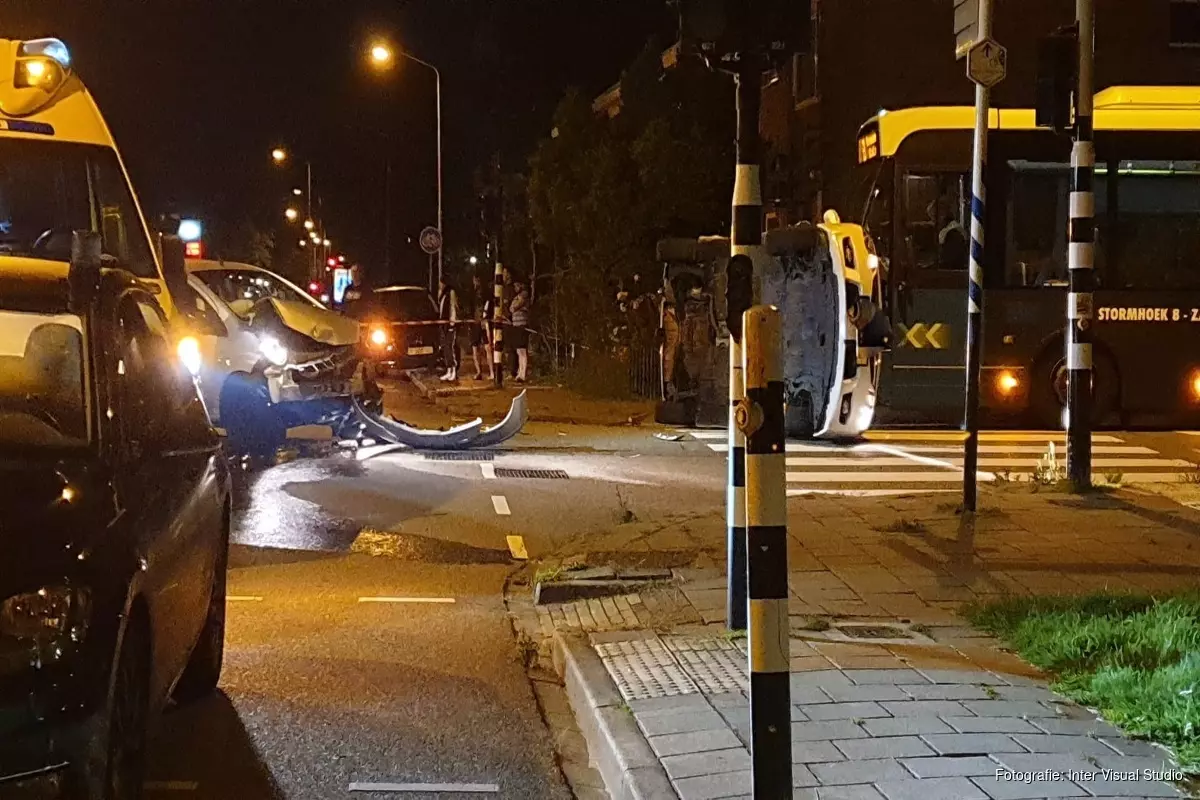 Een auto stak de voorrangsweg over en werd letterlijk omver gereden door een andere auto. Deze auto kwam op zijn kant terecht en klapte tegen een stilstaande bus aan. De witte auto had drie inzittenden waarvan er twee naar het ziekenhuis moesten met onbekend letsel.