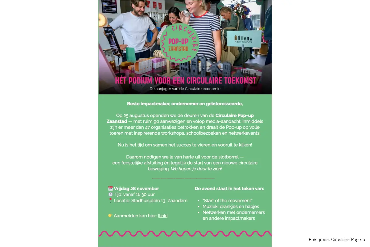 "We hebben in korte tijd laten zien wat er mogelijk is wanneer lokale partijen samen werken aan een circulaire toekomst," zegt Bibi Looijestijn, initiatiefnemer van de Circulaire Pop-up Zaanstad. "Deze slotbijeenkomst is een moment om dat succes te vieren én vooruit te kijken naar wat er nog gaat komen."